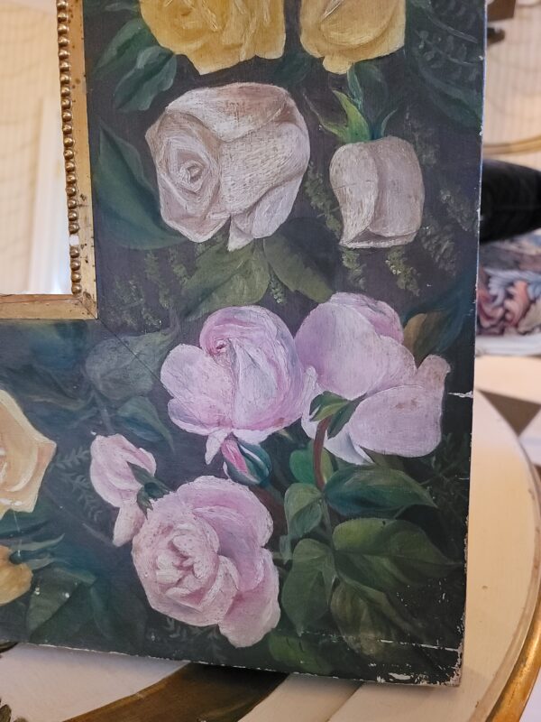 There is a small area of loss of the tiny beading, typical wear to the wood with paint loss around edges and at bottom left lower area. This area appears to have been left without painted roses and there are ferns that extend over towards the plain area. Nonetheless, the painting remains beautiful and pieces like this are becoming more difficult to find.