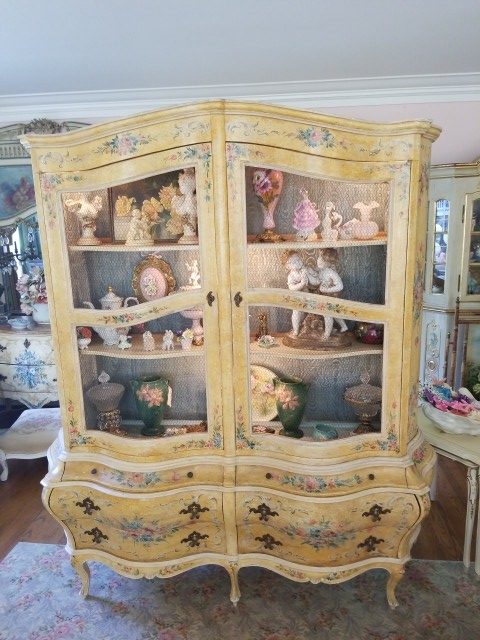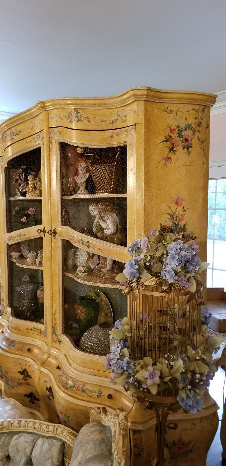 - Fabulous Vintage Italian Decorated Palatial Size Cabinet just perfect for any French Farmhouse or Romantic Shabby Chic Decor…original paint with a deep Old World Gold background and gorgeous flowers painted in rich rose, blue, wine hues and varying types of flowers…the entire front curves so elegantly at door fronts, sides, drawer fronts, and legs…two large doors are beautifully framed around French Style Wire and two ornate handles open to the inner three shelves for display..the interior back, sides, and bottom shelf has been covered many years ago in a pale grayish blue wood pattern velvet fabric and has somewhat faded showing where plates have been displayed previously but is still quite lovely when the cabinet is lighted…there are 4 medium size lights in the interior and a roll on off switch for control..all wiring should be Checked by a professional but works great each time I have lit the cabinet…2 thin drawers and 4 large drawers are beautifully decorated with flowers and have the matching golden metal hardware…the top does lift from the base for moving.